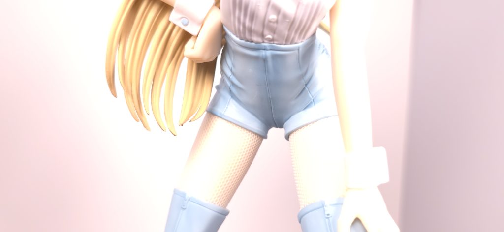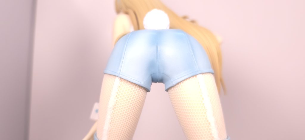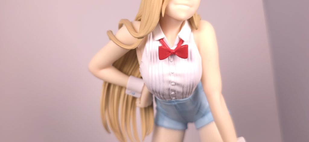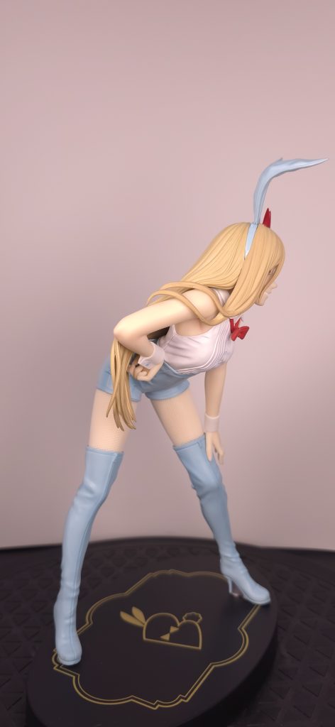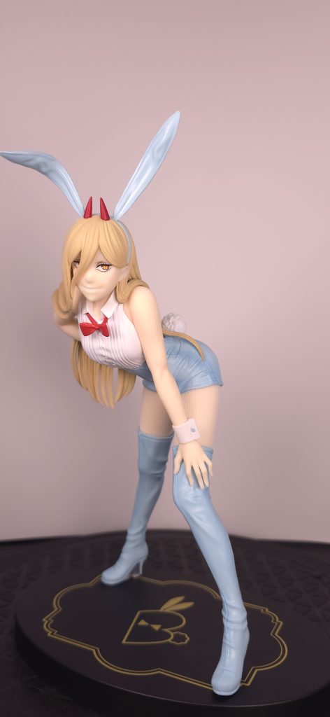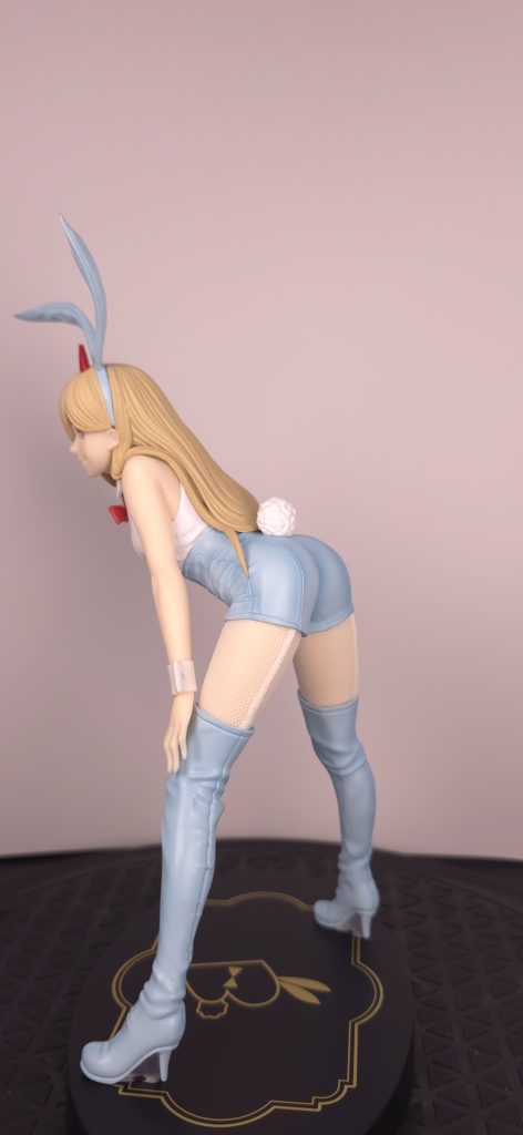 表情は不敵な笑みで、パワーの元気で狂気を孕んだキャラ性をしっかり再現。バニースーツは光沢ラメ仕上げで、ライトブルーの鮮やかさが美しく、脚線美を強調。